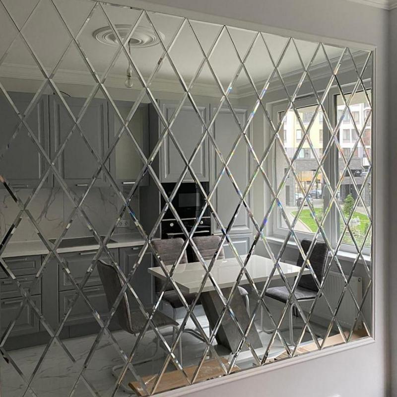 Использована серебристая квадратная зеркальная плитка